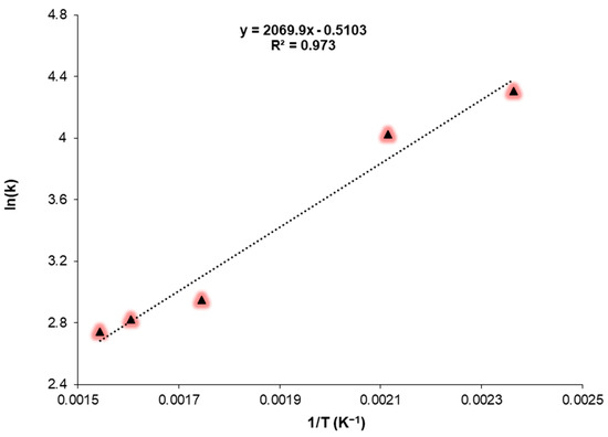 They found that the surface reaction of adsorbed acetone and dissociatively adsorbed atomic hydrogen was the rate-determining step. Unlike their model-fitting results, dissociative adsorption of hydrogen was found to be the rate-determining step. From the Arrhenius plot as shown in Figure 9, activation energy was calculated to be 17.2 kJ/mol, whereas Basu and Pradhan [13] obtained 44.3 kJ/mol, and Sen and Vannice [23] found around 60 kJ/mol. Apparent activation energies varied between 11 and 14 kcal/mol over various copper-based catalysts which showed structure sensitivity [17].