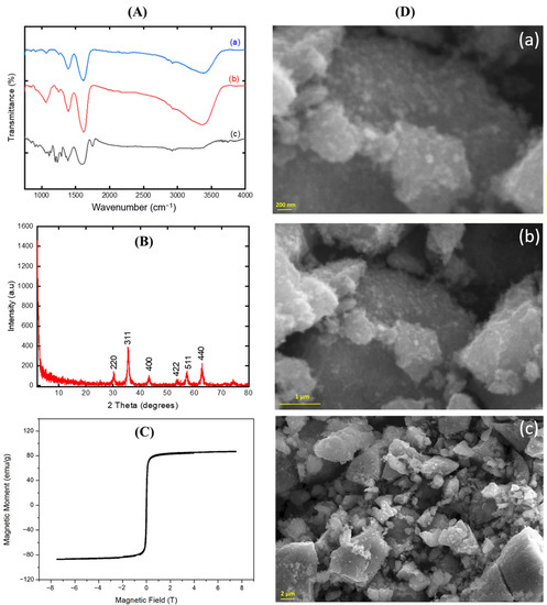 The Fe concentrations in the nanoparticles were measured by a method in our recent study [64]. The infrared spectra of the nanoparticles were recorded on a FT-IR (Perkin Elmer, Waltham, MA, USA). The magnetic properties of the materials were investigated by using a Model P525 Vibrating Sample Magnetometer (VSM) measurement system (Quantum Design, San Diego, CA, USA) at 27 °C. A LEO-Evo 40 XVP SEM was used to monitor the surface macrostructure (200 kV, 0.5 nm probe size).