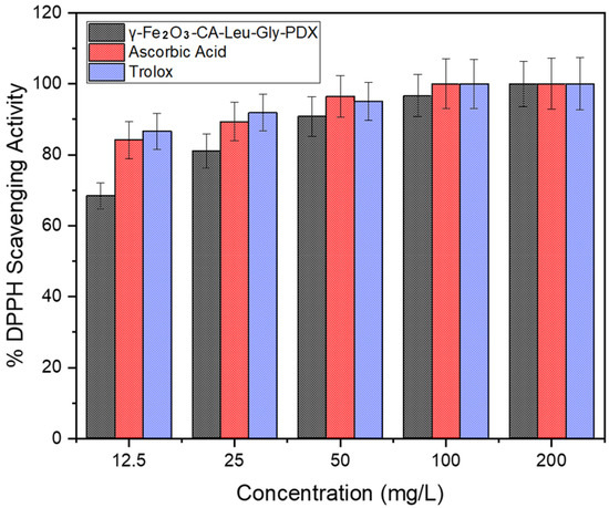 The antioxidant activities were investigated by using the DPPH method. The most important reasons for using this method are its high accuracy, and it is an inexpensive, simple and fast method. The results of the leucyl-glycine (Leu-Gly) functionalized-γ-Fe2O3 magnetic nanoparticles following a biocompatible coating via polydioxanone [γ-Fe2O3-CA-Leu-Gly-PDX] DPPH scavenging activity is shown in Figure 2. The radical scavenging activity of the γ-Fe2O3-CA-Leu-Gly-PDX was found as 68.46, 81.02, 90.76, and 96.66% at concentrations of 12.5, 25, 50, and 100 mg/L, respectively. The highest activity at 100% was obtained for the 200 mg/L concentration. The γ-Fe2O3-CA-Leu-Gly-PDX showed significant radical scavenging activity when compared with the standard antioxidants. It was pointed out that a new type of iron oxide nanoparticles were green synthesized and characterized [33]. The antioxidant activity of the iron oxide nanoparticles by the DPPH scavenging process were investigated and the radical scavenging activity was found approximately at 20% at a concentration of 100 mg/L [34]. Additionally, avidin-coated and uncoated Fe@Au nanoparticles were investigated using the DPPH process for their antioxidant activities [35]. The avidin-coated NPs showed a higher DPPH scavenging activity than avidin uncoated Fe@Au nanoparticles. It was also found that the radical scavenging antioxidant activity was increased when the concentration increased. Shah et al. prepared three types of gallic acid-modified iron oxide nanoparticles (IONPs@GA) [36]. They investigated the DPPH scavenging activity of all the IONPs@GA samples and unfunctionalized IONP. The radical scavenging activity was found to be between 59–78%, and 50% for the unfunctionalized IONP, respectively, at 10−4 M. Our results indicated that γ-Fe2O3-CA-Leu-Gly-PDX can be used as an antioxidant agent for reducing the risk of cancer after further studies.