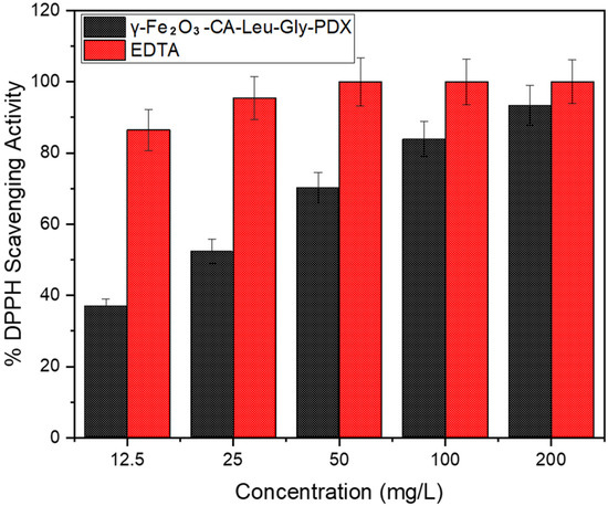 Most of the reactive oxygen species (ROS) are produced as by-products throughout the electron transport system and other physiological and biochemical reactions. For the transition metal ion, however, it is well known that Fe2+ has the ability to sustain free radical generation through redox reactions. Since excessive iron and other free metal ions play a role in the induction and generation of free radicals in living organisms, we investigated the γ-Fe2O3-CA-Leu-Gly-PDX in a ferrous chelating activity test. The γ-Fe2O3-CA-Leu-Gly-PDX demonstrated a concentration-dependent metal chelating activity (Figure 3). When the concentration of the γ-Fe2O3-CA-Leu-Gly-PDX increased from 12.5 mg/L to 25 mg/L, the metal chelating activity increased from 37.03% to 52.41%, respectively. The metal chelating activity was also 71.18 and 83.88% at concentrations of 50 and 100 mg/L, respectively. The maximum metal chelating activity of the γ-Fe2O3-CA-Leu-Gly-PDX was found to be 93.33% at 200 mg/L. Madhu et al. reported that they synthesized and characterized a green iron oxide nanoparticle by using a Solanum tuberosum extract [37]. They also investigated the metal chelating activity of iron oxide NPs and found that new synthesized iron oxide NPs exhibited good metal activity. According to our findings, γ-Fe2O3-CA-Leu-Gly-PDX can be used as a metal chelating agent.