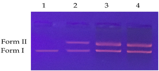 DNA cleavage activity of synthesized γ-Fe2O3-CA-Leu-Gly-PDX. Lane 1, pBR 322 DNA; Lane 2, pBR 322 DNA + 50 mg/L of γ-Fe2O3-CA-Leu-Gly-PDX; Lane 3, pBR 322 DNA + 100 mg/L of γ-Fe2O3-CA-Leu-Gly-PDX; Lane 4, pBR 322 DNA + 200 mg/L of γ-Fe2O3-CA-Leu-Gly-PDX.