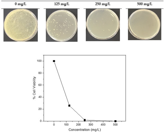 Magnetite nanoparticles (Fe3O4) have superb properties that make them promising agents for antimicrobial usages. The reinforcing impacts of magnetic NPs bind to the microbial cell walls, causing the cell membrane to deteriorate.The microbial cell viability of γ-Fe2O3-CA-Leu-Gly-PDX was investigated against E. coli and the results of the microbial cell viability test are demonstrated in Figure 5. The new synthesized γ-Fe2O3-CA-Leu-Gly-PDX showed significant antibacterial activity. After being treated with various concentrations of γ-Fe2O3-CA-Leu-Gly-PDX, the E. coli growth was inhibited as 86.17, 98.25, and 100% at 125, 250 and 500 mg/L, respectively. Naha et al. reported that microbial cell viability was significantly reduced by using 1.5, 5, and 10 kDa dextran-coated iron oxide nanoparticles and it was also indicated that 25 and 40 kDa-coated iron oxide nanoparticles exhibited lower microbial cell viability than 1.5, 5 and 10 kDa dextran-coated iron oxide nanoparticles [55]. Shi et al. reported that chitosan-coated iron oxide nanoparticles showed a biofilm inhibition by S. aureus and it was also determined that the amount of microbial cell viability was significantly decreased [44]. Metal oxide nanoparticles are of particular attention as antimicrobial agents as they can be prepared with multiple edges, a high surface-to-volume ratio, have unusual crystal morphologies with multiple corners and other potentially reactive areas. Due to the high surface-to-volume ratio of nanoparticles, they can interact with microbial membranes and damage their membrane structures directly or indirectly and cause the microorganisms to be inactivated [56]. In addition to these, iron NPs can cause the disruption of membrane transport processes, the deterioration of protein folding and conformation, and protein aggregation. These effects may also cause antimicrobial activity.