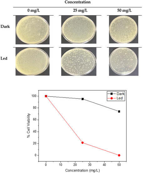 Antimicrobial photodynamic therapy (aPDT) uses a suitable excitation light source with photosensitizers (PSs) and oxygen. Reactive oxygen species (ROS), especially singlet oxygens, are released after a light treatment and non-specific attacks occur from cytotoxic ROS against microorganisms. This strong oxidation and the high reactive agents cause the rapid lipid oxidation of bacteria. As a result, the membrane structure breaks down and, eventually, microbial death occurs [57]. The antimicrobial photodynamic therapy (aPDT) by γ-Fe2O3-CA-Leu-Gly-PDX was investigated by using LED irradiation against E. coli for 120 min. The results of the aPDT are shown in Figure 6. Iron oxide nanoparticles can be used like photosynthesis. As seen in Figure 6, the γ-Fe2O3-CA-Leu-Gly-PDX inhibited the microbial growth by 98% and 99.99% at 25 and 50 mg/L, respectively, in the dark, while a 100% cell inhibition was observed in the γ-Fe2O3-CA-Leu-Gly-PDX 25 and 50 mg/L with the LED irradiation. Ma et al. pointed out that Fe3O4-TNS nanosheets demonstrated higher photocatalytic antimicrobial activity against Gram-positive S. aureus and Gram-negative E. coli than pure TNS and Fe3O4 [58]. It was also reported that the antimicrobial activity was decreased by 87.2% and 93.7% against the E. coli and S. aureus after 2 h of solar light irradiation at a concentration of 100 µg/mL Fe3O4-TNS, respectively. Pan et al. synthesized and characterized reduced graphene oxide (rGO)-iron oxide nanoparticles (rGO-IONP) and they investigated the antimicrobial photodynamic therapy of rGO-IONP+H2O2 treated with near infrared (NIR) laser irradiation. They observed significant antimicrobial activity when compared with a control group [59].