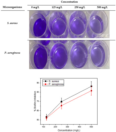 Biofilm is a polymeric structure that allows microorganisms to attach to each other or to a surface. This polymeric structure acts as a shield against microorganisms to immune cells and antibiotics. As a result, microorganisms that are highly resistant to antibiotics-application emerge. In addition, they can adhere strongly to medical implant surfaces, causing the contamination of various microbial infectious diseases. For these reasons, interest in agents that prevent biofilm formation is increasing day by day [44]. Here, we investigated the influence of γ-Fe2O3-CA-Leu-Gly-PDX on the biofilm formation of S. aureus and P. aeruginosa at different concentrations after 72 h of incubation. The results of the biofilm inhibition are depicted in Figure 7. A significant inhibition in the biofilm formation was observed in the presence of the γ-Fe2O3-CA-Leu-Gly-PDX for both test microorganisms. It was also determined that the biofilm inhibition activity of γ-Fe2O3-CA-Leu-Gly-PDX was concentration-dependent. When the concentration increased from 125 mg/L to 250 mg/L, the biofilm inhibition was increased from 53.28% to 69.71% for S. aureus and from 51.96% to 65.37% for P. aeruginosa. The highest biofilm inhibition was found to be 86.34% and 81.54% for S. aureus and P. aeruginosa at concentrations of 500 mg/L, respectively. Erci and Cakir-Koc reported on the biofilm inhibition activity of synthesized FeONPs, studied using S. aureus as a test microorganism after a 24 h incubation [34]. According to their results, the highest biofilm inhibition activity was shown at 100 mg/L, at nearly 45%. Thukkaram et al. examined the influence of iron oxide NPs on the formation of biofilm on various bio-material surfaces and pluronic-coated surfaces and it was reported that an effective biofilm inhibition was obtained at a high concentration of iron oxide NPs against S. aureus, E. coli and P. aeruginosa [60]. Sathyanarayanan et al. investigated the impact of gold and iron oxide NPs on S. aureus and P. aeruginosa biofilms [56] and it was found that the biofilm production was decreased with high concentrations of gold and iron-oxide NPs when compared with a control. Naha et al. investigated the biofilm inhibition using dextran-coated iron oxide nanoparticles and they found that a maximal anti-biofilm activity was obtained with 10 kDa of dextran-coated iron oxide NPs. They also demonstrated that an antibiofilm inhibition occurred via the mechanisms of an EPS-matrix breakdown [55]. It was found that tobramycin-conjugated and alginate-coated iron oxide NPs were demonstrated to inhibit the production of a biofilm by P. aeruginosa [61]. Khalid et al. reported on an easy process for the synthesis of rhamnolipid (RL)-coated silver (Ag) and iron oxide (Fe3O4) NPs and they also investigated the biofilm inhibition against biofilms produced by S. aureus and P. aeruginosa [41]. The silver (Ag) and iron oxide (Fe3O4) NPs exhibited significant biofilm inhibition activity not only during the biofilm generation but also on preformed biofilms. These ions disrupted the effective electrostatic interaction between bacterial cells in the biofilm, and as a result, these ions penetrated the cell and caused a biofilm inhibition by reducing or blocking the adhesion of the cells to each other [41].