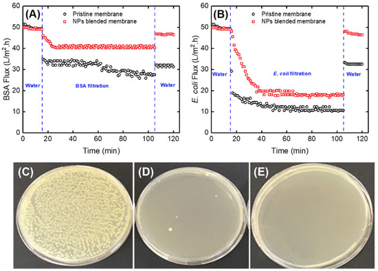 The pristine and modified membranes were also tested for E. coli filtration (Figure 8B). The fluxes were 27.5 ± 2.5 and 40.3 ± 3.5 L/m2/h for the pristine and NPs-blended membranes, respectively. After physical cleaning of the membrane surface, the water fluxes were calculated as 31.8 ± 2.7 and 46.7 ± 3.4 L/m2/h for the pristine and NPs-blended membranes, respectively. The E. coli removal results (Figure 8C–E) showed that the pristine and modified membranes removed 99.9% and 100%, respectively.