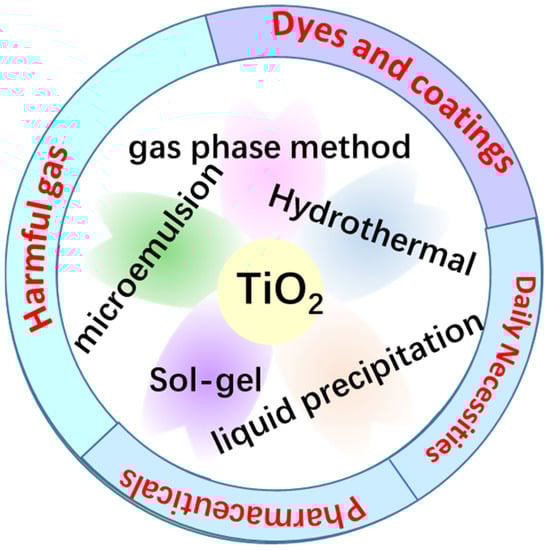 Nanomaterials with various sizes, morphologies, and properties have been increasingly studied and used in various applications, due to the rapid development of nanomaterial preparation technologies [,,,,]. TiO2 photocatalysis mainly depends on the photocatalytic material and light source, based on the TiO2 photocatalysis principles introduced above. Because the light source is an external condition, semiconductor TiO2 photocatalysis research has focused on the photocatalytic material [,,]. In this paper, the current methods used to prepare TiO2 are briefly classified and reviewed to provide the reader with an understanding of how TiO2 is prepared and how new high-performance photocatalytic materials are developed. TiO2-preparation processes are divided into three types, according to the medium used, namely solid-phase, gas-phase, and liquid-phase.