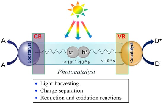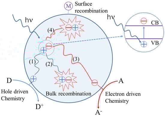 A photocatalysis reaction refers to a process in which the photocatalyst itself does not change when irradiated with light; rather, it converts light energy into chemical energy to promote the production or decomposition of compounds. While photosynthesis is the most representative example of photocatalysis in nature [], the most widely studied and applied photocatalysts are semiconductor-based. A semiconductor is a material whose conductivity lies between that of a conductor and an insulator. The lowest energy level occupied by valence electrons in the electronic energy band structure of a semiconductor is referred to as the “valence band”, and the lowest unoccupied energy level is referred to as the “conduction band”. The energy region between the conduction and valence bands is referred to as the “forbidden band”, which is a discontinuous region whose width depends on crystal structure and interatomic relationships and is a characteristic parameter of a semiconductor material []. The energy band structure of a semiconductor affects light absorption and the photocatalytic performance of the material. When a photocatalyst is irradiated with photons with energies greater than the forbidden band width of the semiconductor, the electrons (e−) in the valence band are excited and transition to the conduction band, with holes (h+) simultaneously created in the valence band. Photogenerated electrons are reductive, and photogenerated holes are oxidative; these photogenerated carriers migrate to the catalyst surface to participate in catalytic redox reactions, as shown in the schematic diagram in Figure 2 []. The photocatalytic reaction initiates from the generation of electron−hole pairs upon light irradiation. When a semiconductor photocatalyst absorbs photons with energy equal to or greater than its Eg, the electrons in VB will be excited to CB, leaving the holes in VB. In contrast, photogenerated electrons and holes are trapped by defect sites in the bulk or surface of the catalyst, where they recombine to release photons or heat []. Carrier lifetime depends on the rate of photogenerated-carrier recombination; fast recombination leads to short lifetimes, which, in turn, limits the photochemical energy conversion efficiency of the catalyst.