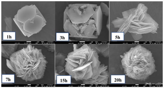 SEM images of products obtained in various reaction stages (1 h,3 h,5 h,7 h,15 h, 20 h) [].