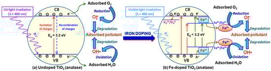 Schematic representation of the electronic band structure of (a) undoped anatase TiO2 and (b) Fe-doped anatase TiO2. Reprinted/adapted with permission from Ref. []. 2018, Elsevier.