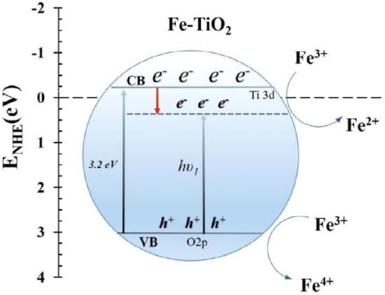 Schematic diagram showing the energy levels of TiO2 doped with Fe (transition metal). Reprinted/adapted with permission from Ref. []. 2018, Elsevier.