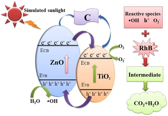Depositing a C-point on the surface of the catalyst is equivalent to forming a short-circuit microcell with a semiconductor heterojunction and a carbon layer as the electrode. For example, Figure 9 shows the photodegradation catalysis mechanism that operates after doping a C-point with ZnO/TiO2. The h+ generated by the TiO2 electrode oxidizes the organic matter in the liquid phase, while the e− flows to the metal electrode and reduces the oxidized components in the liquid phase, thereby lessening the e−/h+ recombination rate and improving the activity of the catalyst [].