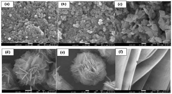 SEM images of TiO2 samples prepared with different amounts of HF: (a) pure-TiO2, (b) T-1F, (c) T-3F, (d) T-5F, (e) T-7F, and a high magnification image of (f) T-7F [].