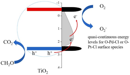 Metal doping can be categorized into transition-metal, noble-metal, and rare-earth-metal doping, according to the mechanism used by the metal-ion dopant to influence the photocatalytic activity of TiO2. An intermediate state energy level is typically introduced into the TiO2 bandgap by metal doping, which changes the motional states of the carriers; consequently, the energy band structure of TiO2 can be controlled by adjusting the distributed states of electrons and holes, in order to change the photocatalytic activity of TiO2. On the one hand, appropriate metal ions are selected to replace Ti4+ in the TiO2 lattice, and impurity energy levels are introduced near the conduction band. Hence, valence band electrons can be excited by photons with energies less than the original forbidden band width (3.2 eV) to impurity energy levels, and the photogenerated electrons in the conduction band can also transition to impurity energy levels, which promotes photogenerated electron–hole pair separation []. On the other hand, some transition metal ions act as electron traps and form intermediate valence ions after capturing electrons, which also realizes photogenerated electron–hole separation []. The energy levels of most dopant ions lie between the valence and conduction bands of TiO2; consequently, the introduction of dopant ions not only increases the electron–hole-pair capture rate in the crystal, but also prevents electron–hole recombination, thereby improving the photocatalytic ability of TiO2 []. The introduction of metal dopants into the TiO2 lattice leads to the formation of new energy states below the conduction band and above the valence band, and these new energy states act as charge-trapping sites that improve the charge-separation efficiency (Figure 5) []. However, the TiO2 lattice becomes seriously distorted when the amount of dopant exceeds a certain level, which hinders further improvements in photocatalytic performance. Therefore, determining the optimal position and amount of the dopant element remains challenging.