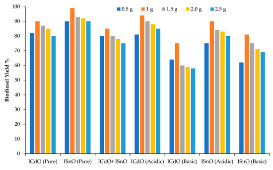 Conversion efficiency increases with the increase in catalysts amounting to up to 1 g of catalyst concentration. The maximum yield was obtained for 1g of the catalyst with the conversion efficiency of 90%, 99%, 85%, 94%, 75%, 90%, and 81% yield, for catalysts of ICdO (pure), ISnO (pure), ICdO + ISnO, ICdO (Acidic), ICdO (basic), ISnO (acidic), and ISnO (basic), respectively. The maximum conversion efficiency for base-catalyzed transesterification was achieved at 1g of ICdO (basic) and ISnO (basic) catalysts (Figure 1). During tests, a further increase in basic catalyst concentration results in the production of an emulsion. This emulsion increases the viscosity and prevents the glycerol separation, thus decreasing the methyl ester yield [31]. The quantity of acid catalysts used in the transesterification reaction also affects the reduction in acid value [32]. Biodiesel yield also increases with an increase in catalyst concentration up to 1 g of the ICdO (acidic) and ISnO (acidic) catalyst (Figure 1). There is no considerable improvement in biodiesel yield or further increase in the amounts of ICdO (acidic) and ISnO (acidic) catalysts.