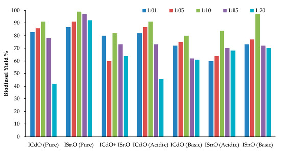 The ratio of oil-to-methanol is very critical in determining the extent of ester formation. The oil-to-methanol ratio is varied in order of 1:01, 1:05, 1:10, 1:15, and 1:20, to check the effect of its concentration on the percentage of produced biodiesel [33]. As shown in Figure 2, the yield of biodiesel increased as the methanol-to-oil ratio increased from 1:01 to 1:10. The maximum yield obtained at oil-to-methanol ratios of 1:10 with 91%, 99%, 82%, 91%, 80%, 84%, and 97%, for ICdO (pure), ISnO (pure), ICdO + ISnO, ICdO (acidic), ICdO (basic), ISnO (acidic), and ISnO (basic), respectively. However, a further increase in the molar ratio from 1: 15 to 1:20 decreased biodiesel yield. When the oil-to-methanol ratio increases, the glycerol separation is difficult as the excess methanol delays the decantation by gravity, causing a decrease in biodiesel yield. The glycerol is still present in the biodiesel phase. According to Harreh et al. [31], the residual glycerol in the solution aids in shifting the equilibrium back to the left and lowers the biodiesel yield.