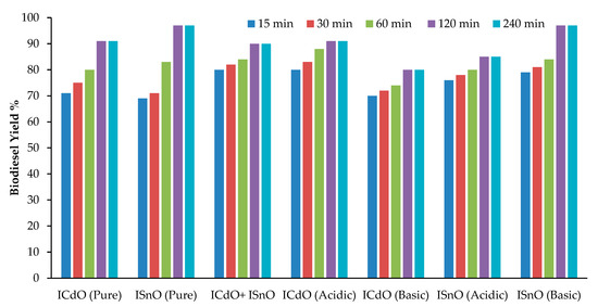 The reaction mixture was stirred for a specific time and particular temperature to complete the transesterification reaction. It was observed that the yield of biodiesel increases with reaction time and gives maximum yield at 120 min with 91%, 97%, 90%, 91%, 80%, 85%, and 97%, for ICdO (pure), ISnO (pure), ICdO + ISnO, ICdO (acidic), ICdO (basic), ISnO (acidic), and ISnO (basic), respectively (Figure 3). The conversion of fatty acids into esters increases with reaction time (Figure 3). In the beginning, the reaction is slow due to the mixing and dispersion of the oil in alcohol, but afterward, the reaction takes place very quickly. After 2 h of reaction time, the yield remains constant. It indicated that 2 h is the optimum reaction time for the transesterification reaction [34].
