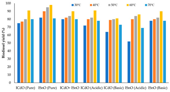 An optimum temperature is required to obtain an optimum yield of biodiesel. Reaction temperatures of 30 °C, 40 °C, 50 °C, 60 °C, and 70 °C, were chosen to find an optimum temperature for biodiesel production. Several biodiesel samples were prepared at different temperatures, and the produced biodiesel yield was recorded. A maximum biodiesel yield was obtained at 60 °C (near the evaporating temperature of methanol) with 91%, 98%, 90%, 91%, 81%, 86%, and 90% yield, of ICdO (pure), ISnO (pure), ICdO + ISnO, ICdO (acidic), ICdO (basic), ISnO (acidic), and ISnO (basic), respectively (Figure 4). The reaction rate increases with an increase in reaction temperature to a limited extent. According to Bello et al. [35], the optimum temperature (60 °C) for biodiesel production was near the evaporating temperature of methanol (64 °C). A further increase in temperature decreases the biodiesel yield due to the evaporation of methanol. The reaction temperature influences biodiesel yield and reaction rate. According to research, a further rise in temperature will negatively affect the conversion process [36].
