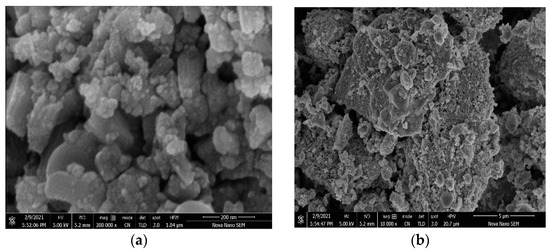 SEM images of prepared nano-catalysts of ICdO + ISnO. (a) SEM image of ICdO + ISnO taken at 200 nm, (b) SEM image ICdO + ISnO taken at 5 µm.