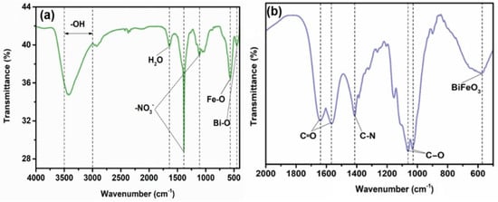 (a) FTIR spectrum of synthesized BFO and (b) FTIR spectrum of synthesized CBB.