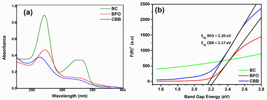The optical properties of the synthesized BFO, biochar, and CBB were examined using UV-DRS measurement. The UV/Vis diffuse reflectance spectrophotometry technique was performed to evaluate the reflectance spectra of the samples and for band gap calculations; Figure 3. The band gap of the photocatalysts was determined and calculated according to the Kubelka–Munk theory. The direct band gap energy was estimated from the tangent line in the plot of the squared Kubelka–Munk functions, F(R)2 against the photon energy of E = hv. From the plot observed in Figure 3b, extrapolation of the tangent line for BFO and CBB revealed that the direct band gap energy was at 2.20 eV and 2.17 eV, respectively. In this study, the direct band gap energy of BFO corresponds to the range reported by Sharma and Kumar (2020) [18]. The carbon in biochar can act as a sensitizer when doped with photocatalytic nanoparticles, narrowing the light sensitivity of the synthesized composite [19]. As a result, adding biochar to BFO reduces the band gap of CBB, thereby improving photocatalytic activity.