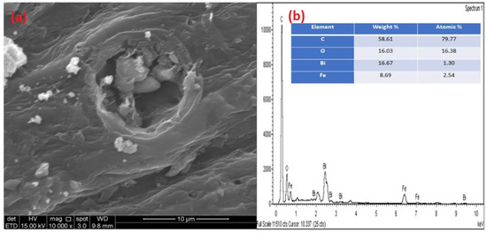 Figure 6a depicts the morphology of CBB nanoparticles. The addition of biochar resulted in the morphology of BiFeO3, in which the BiFeO3 nanoparticles were randomly distributed on the rough surface and multi-layered structure of chitosan along with biochar. Figure 6a clearly shows the integration of multi-layered chitosan, the rhombohedral perovskite structure of BiFeO3, and porous biochar. It appears that some tiny particles have agglomerated on the surface of chitosan because of the interaction between chitosan, biochar, and BiFeO3. Chitosan changes the physiochemical properties of biochar and improves its impact on water quality [22]. In addition, owing to the π–π interaction, chitosan was mostly covered on the biochar, giving it a larger specific surface area and higher thermal stability, while BiFeO3 was widely dispersed in the combination. The presence of C, O, Bi, and Fe was also confirmed using EDX. The elemental percentage weight of the CBB photocatalyst was found to be 58.61% of C, 16.03% of O, 16.67% of Bi, and 8.69% Fe, as shown in Figure 6b.