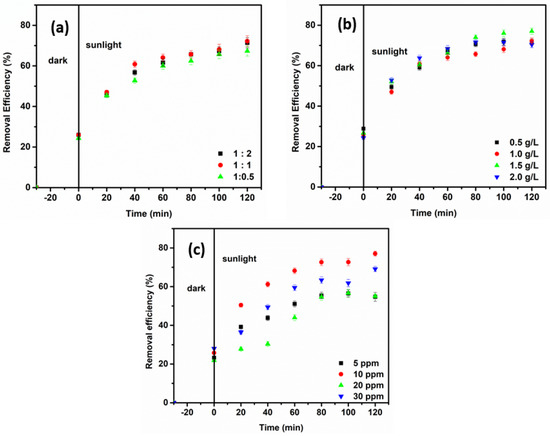 The performance of composite BFO/biochar (CBB) photocatalyst on the degradation of ciprofloxacin (CIP) was tested under different parameters, as shown in Figure 9a–c. The first parameter investigates how the composite ratio of BFO to biochar works in a 10 ppm CIP solution for 2 h and 30 min. This parameter is very essential as it determines which ratio works best for the removal of CIP. In this study, the amount of BFO remained unchanged, while the amount of biochar increased steadily with the different ratios of 1:0.5, 1:1, and 1:2, respectively, as shown in Figure 9a. According to Zhou et al. (2020) [26], the synthesis of biochar-based nanocomposites enhances the level of surface functional groups, increases pore properties, and imparts magnetic separation capabilities and catalytic properties for the degradation and treatment of wastewater. From the results tabulated in Table 2, the increase in biochar composition from 0.5 to 1.0 shows an increase in the removal efficiency of CIP from 67.32% to 72.19%. However, for the composite CBB of 1:2, the removal efficiency of CIP decreased slightly to 71.38%. The study shows that the dark reaction boosted approximately 25% of the removal efficiency of CIP at different ratios of BFO to biochar. This occurrence could be explained by the fact that the presence of biochar contributed to the adsorption of CIP, whereas BFO had a low adsorption ability to CIP without sunlight and synergized better when expose to visible light. The best composite ratio of CBB for the photocatalytic degradation of CIP was determined to be 1:1.