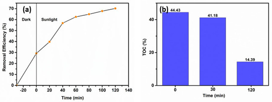 The total organic carbon in CIP solution was examined after irradiation under sunlight for 2 h. From the plot in Figure 11a,b, after exposure of sunlight for 120 min, 70.16% of CIP was degraded by CBB. In contrast, the removal efficiency of organic carbon reduced to 14.39% from 44.43% before treatment, as shown in Figure 11b. A low percentage of total organic content after treatment by CBB confirmed the efficiency of composites to degrade the pollutants and it underwent mineralization and the formation of organic intermediates after the photocatalysis reaction.