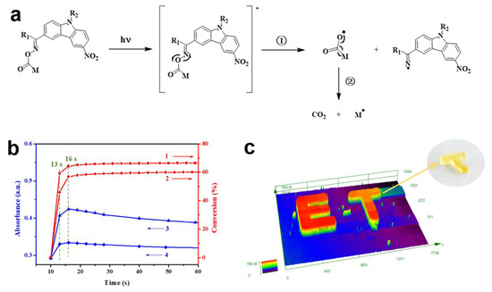 (a) Proposed photoinitiation mechanism of OXEs ([]*: excited state of OXEs). (b) Line 1: photopolymerization profiles (acrylate function conversion vs. irradiation time) of the D1/TMPTA system. Line 2: photopolymerization profiles (acrylate function conversion vs. irradiation time) of the D2/TMPTA system. Line 3: the curve of absorption intensity (absorbance vs. irradiation time) of CO2 that was obtained from the D1/TMPTA system. Line 4: the curve of absorption intensity (absorbance vs. irradiation time) of CO2 that was obtained from the D2/TMPTA system. (c) Letter pattern that was observed using a digital microscope. Adapted from [54] with permission from the American Chemistry Society.