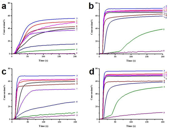 Photopolymerization profiles of TMPTA (acrylate function conversion vs. irradiation time) in laminate (~25 μm) under LED@405 nm irradiation in the presence of (a) PI alone (0.3%, mol), (b) PI/Iod (0.3%/1%, mol/mol), (c) PI/EDB (0.3%/1%, mol/mol), and (d) PI/Iod/EDB (0.3%/1%/1%, mol/mol/mol): curve 1: PI = BT1; curve 2: PI = BT2; curve 3: PI = BT3; curve 4: PI = BT4; curve 5: PI = BC1; curve 6: PI = BC2; curve 7: PI = BC3; curve 8: PI = ITX; curve 9: PI = BP. The photopolymerization starts at t = 10 s. Adapted from [61] with permission from the Royal Society of Chemistry and the Chinese Chemical Society.