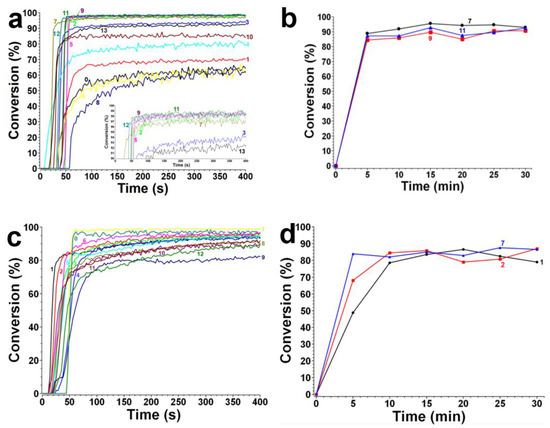 (a) Photopolymerization profiles of TMPTA (conversion of C=C bonds vs. irradiation time) initiated by an iodonium salt and EDB upon exposure to LED@405 nm in laminate in the presence of dyes 1–13 at the same weight ratio: dye:Iod:EDB = 0.1%:2%:2% in TMPTA. Curve 0: Iodonium salt: EDB = 2%:2% in TMPTA without dye. (b) Photopolymerization profiles of TMPTA (conversion of C=C bonds vs. irradiation time) initiated by the iodonium salt and EDB upon exposure to sunlight in laminate in the presence of dyes at the weight ratio: dye:Iod:EDB = 0.1%:2%:2% in TMPTA; (black) dye 7; (red) dye 9; (blue) dye 11. (c) Photopolymerization profiles of TA (conversion of C=C bonds vs. irradiation time) initiated by an iodonium salt and EDB upon exposure to LED@405nm in laminate in the presence of dyes 14–25 at the same weight ratio: dye:Iod:EDB = 0.1%:2%:2% in TA. Curve 0′: Iodonium salt: EDB = 2%:2% in TA without dye. (d) Photopolymerization profiles of TA (conversion of C=C bonds vs. irradiation time) initiated by the iodonium salt and EDB upon exposure to sunlight in laminate in the presence of dyes at the weight ratio: dye:Iod:EDB = 0.1%:2%:2% in TA; (black) dye 14; (red) dye 15; (blue) dye 20. Adapted from [62] with permission from Wiley.