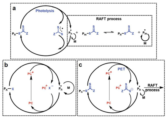Representative example mechanisms for photoRDRP. (a) Photoiniferter polymerization. (b) Photoactivated atom transfer radical polymerization (photoATRP). (c) Photoinduced electron/energy-transfer reversible addition–fragmentation chain-transfer (PET-RAFT) polymerization. PC: photocatalyst (PC•+ was denoted as PC+ in the figures); Pn•: propagating radical species; M: monomer; PC*: excited state of photocatalyst. Adapted from [63] with permission from Wiley.