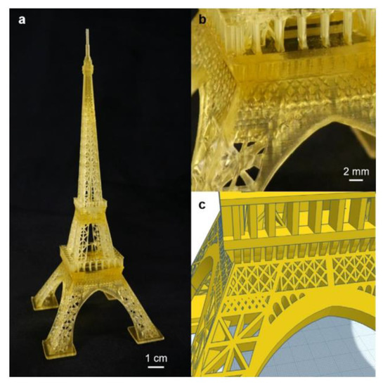 Eiffel Tower figurine that was 3D-printed using novel resins containing BTPA as RAFT agent. (a) Full-sized 3D-printed object; (b) close-up of 3D-printed figurine showing intricate, high-resolution details, and (c) the corresponding close-up of the original 3D model design. Object was printed using a ratio of [BTPA]:[PEGDA]:[DMAm]:[TPO] = 1:40:160:2 under violet light (λmax = 405 nm, I0 = 0.81 mW cm−2) irradiation. Adapted from [69] with permission from Wiley.
