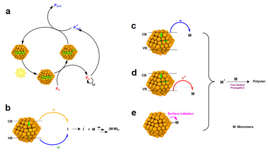(a) SNMs serve as photocatalysts during photopolymerization processes. (b) SNMs serve as photoactivators in the presence of co-initiators for conventional free-radical photopolymerization and SNMs serve as photoinitiators during photopolymerizations: (c) the reduction of monomer via electron transfer from conduction band, (d) oxidation of monomer via hole transfer from valence band, and (e) radical generation on the SNMs’ surface (CB is the conduction band and VB is the valence band). Adapted from [83] with permission from the American Chemical Societies.