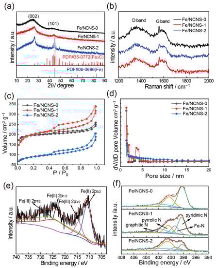 (a) XRD patterns, (b) Raman spectrum spectra (c) N2 adsorption-desorption isotherms, (d) pore size distribution of Fe/NCNS-0, Fe/NCNS-1 and Fe/NCNS-2, (e) Fe 2p spectra of Fe/NCNS-1, (f) N 1s spectra of Fe/NCNS-0, Fe/NCNS-1 and Fe/NCNS-2.