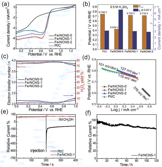 (a) LSV curves of Fe/NCNS-0, Fe/NCNS-1, Fe/NCNS-2 and commercial Pt/C at 1600 rpm·min−1 in 0.5 M H2SO4, (b) comparison of jk at 0.85 V and E1/2 of Fe/NCNS-0, Fe/NCNS-1, Fe/NCNS-2 and commercial Pt/C, (c) electron transfer number (n) and the yield of H2O2; (d) Tafel plots of Fe/NCNS-0, Fe/NCNS-1, Fe/NCNS-2 and commercial Pt/C, (e) the tolerance to methanol of Fe/NCNS-1 and commercial Pt/C, (f) electrochemical stability test of Fe/NCNS-1 in 0.5 M H2SO4.