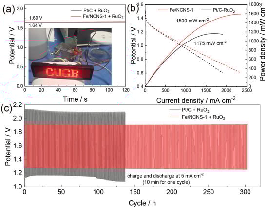 The application of Fe/NCNS-1 as the air cathode in rechargeable ZABs was investigated. Figure 5a showed that the LED panel can be continuously powered by the prepared ZAB with Fe/NCNS-1 + RuO2 as the air cathode. The high open circuit voltage of 1.69 V was attributed to the excellent ORR performance of the Fe/NCNS-1. The discharge polarization curves and the corresponding power density of the ZAB were shown in Figure 5b. The ZAB showed a higher discharge voltage at the same current density relative to ZAB with Pt/C + RuO2 as the air cathode, suggesting its better rechargeability and energy efficiency. Furthermore, the peak power density was calculated on a basis of the discharge polarization curve for the batteries. Figure 5b indicated that ZAB with Fe/NCNS-1 + RuO2 as the air cathode displayed a much higher power density of 1590 mW cm−2 than ZAB with Pt/C + RuO2 as the air cathode (1175 mW cm−2). The excellent catalytic performance in ZABs outperformed many reported Fe-N-C materials (Table S2). Figure 5c showed the cycling curves recorded at the constant current density of 5 mA cm−2 with 10 min for each cycle. The charge/discharge voltage gap was 0.63 V at 5 mA cm−2. Further, the voltage gap increased by only 0.08 V after 300 cycles, suggesting the excellent charge/discharge cycling performance of the battery with Fe/NCNS-1 + RuO2, even under highly oxidative operating conditions in 6 M KOH.