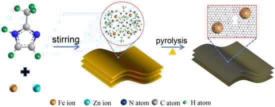Typically, Fe/Zn dual-metal ZIFs (Fe/Zn-ZIFs) were prepared according to previously reported methods [] with a slight modification. In brief, 0.1512 g ZnCl2 and different amounts of FeCl3·6H2O (0.000 g, 0.0375 g or 0.0749 g) were dissolved in 40 mL of deionized (DI) water. Then, a 40 mL solution of 2-Methylimidazole (0.985 g) was added. The mixture was stirred vigorously for 24 h at room temperature. Fe/Zn-ZIFs were collected through centrifugation, washed with water and dried at 60 °C for 12 h. Fe/Zn-ZIFs with Fe/Zn ratios of 0:16, 1:16 and 2:16 were denoted as Fe/Zn-ZIF-0, Fe/Zn-ZIF-1 and Fe/Zn-ZIF-2. Fe/Zn-ZIFs were then carbonized at 900 °C for 2 h in a N2 atmosphere. The obtained products were marked as Fe/NCNS-0, Fe/NCNS-1 and Fe/NCNS-2.