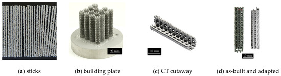 Representation of the investigated sticks and POCS based on Cu50Al50 alloy: (a) PBF-EB sticks; (b) POCS structures on starter plate in the PBF-EB process; (c) section of a CT reconstruction of a POCS; and (d) as-built structure (left) and mechanically post-processed POCS to methanol reactor dimension (right), adapted from [17].