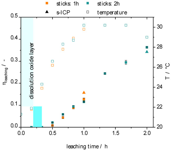 During the first 0.5 h of the leaching process, no change in the Al concentration was observed. We assume that this is due to the slow dissolution of the oxide layer on the surface of the Cu50Al50 sticks. After this initial phase, a linear increase in the leaching efficiency was observed. This was accompanied by an increase in temperature and the evolution of H2 gas. The comparison between two experiments, with durations of 1 and 2 h, respectively, shows good reproducibility of the leaching process.