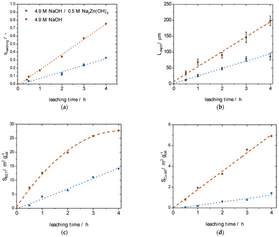 All of these studies (Figure 4a–d) show, that the leaching process progresses much more rapidly in NaOH solution than in the NaOH/Na2Zn(OH)4 solution. After identical leaching time, the sticks in the NaOH solution achieve higher leaching efficiencies, higher leaching depths, higher specific surface areas, and higher active Cu surface areas. Specifically the leaching efficiency in NaOH/Na2Zn(OH)4 reaches 0.3 after 4 h, whereas in pure NaOH a leaching efficiency of 0.35 is already reached after 2 h. A similar trend can be observed for the leaching depths and surface areas (BET and active Cu surface). The largest difference is observed in the active copper surface area, which is, after 4 h, about seven times higher in the NaOH solution compared to the NaOH/Na2Zn(OH)4 solution.