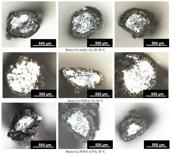 The preparation of structured Raney-Cu catalysts was carried out in the same manner, except that the leaching reaction was controlled to produce a defined core shell structure. The samples were activated in two different leaching solutions (4.9 M NaOH and 4.9 M NaOH/0.5 M Na2Zn(OH)4) to investigate the effect of sodium zincate on the catalytic properties. The leaching solution was prepared in excess (100 mL) and the Cu50Al50 samples were added (2–4 g). Leaching times between 0.5–5 h were applied to determine the leaching kinetics. After the leaching reaction, the resulting Raney-Cu catalyst was neutralized in deionized water. Due to the pyrophoric properties of Raney-catalysts, the activated catalyst samples were stored under water. To study the leaching kinetics, liquid samples of the leaching solution were taken, and their aluminum content was measured via inductively coupled plasma optical emission spectroscopy (ICP-OES, Plasma 400 from Perkin-Elmer, Waltham, MA, USA).