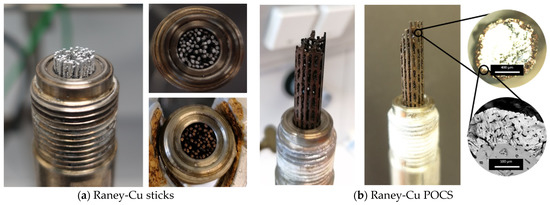 In order to investigate the influence of the macroscopic structure on the catalytic activity, the Raney-Cu catalysts were manufactured in two different structure variations: sticks (Figure 1a) and POCS (Figure 1b). Both structural variations were fabricated by PBF-EB.