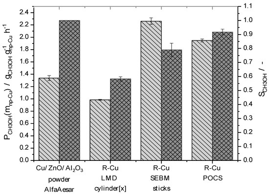 The selectivity for methanol is slightly lower for the new Raney-Cu catalysts compared to the commercial methanol catalyst. The sticks achieved a selectivity of 80%, the POCS reached a selectivity of 90%. This lower selectivity is due to the formation of dimethylether (DME), which has been observed as a consecutive product of the further dehydration of two methanol molecules according to Equation (5). This has also been observed to a greater extend and reported previously for the LMD cylinders [19].