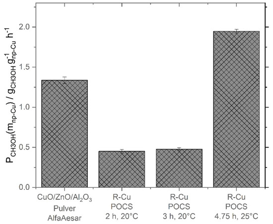 The synthesized catalysts were compared with respect to their methanol productivity. The methanol productivity is often related to the mass of the catalyst, as this is the easiest accessible value for comparison (see Equation (12)).
