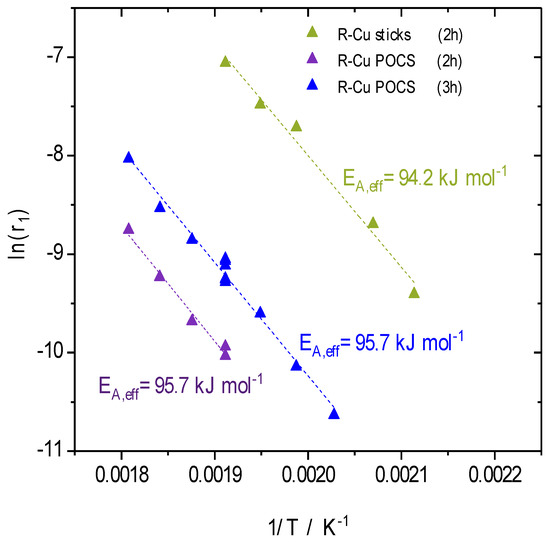 The plot of the logarithm of the reaction rate (ln(r1)) over the inverse temperature (1/K) shows effective activation energies between 94.2 kJ mol−1 (sticks) and 95.7 kJ mol−1 (POCS). These numbers are in good agreement with previously published values for methanol synthesis using Cu/ZnO catalysts [22,23,24].