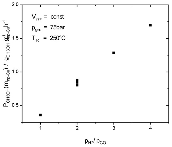 To determine the order of reaction with respect to H2, a variation of the H2 partial pressure was carried out, using the Raney-Cu sticks (Figure 10). For these experiments, N2 was added to keep the total pressure as well as the CO partial pressure constant. Figure 10 shows that the methanol productivity correlates linearly with the H2/CO ratio. The effective reaction order with respect to H2 has been determined to 1.02. For conventional co-precipitated Cu/ZnO methanol synthesis catalysts, reaction orders of 1 to 1.5 with respect to hydrogen have been reported [13].