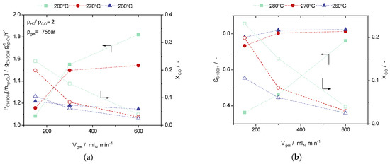 A variation of the volume flow reveals the influence of the residence time on the productivity and selectivity (Figure 11). At low volume flow of 150 mLN min−1, the productivity ranges between 1.1 and 1.2 gCH3OH gnp-Cu−1 h−1, irrespective of the temperature. Increasing the volume flow to 300 mLN min−1 and further to 600 mLN min−1 did not improve the productivity at a process temperature of 260 °C but resulted in a significant increase of the productivity at higher temperatures (from 1.1 gCH3OH gnp-Cu−1 h−1 at 150 mLN min−1 up to 1.8 gCH3OH gnp-Cu−1 h−1 at 600 mLN min−1 and 280 °C).