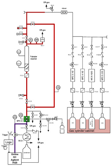 Flowsheet of the laboratory rig used in our CO hydrogenation experiments.