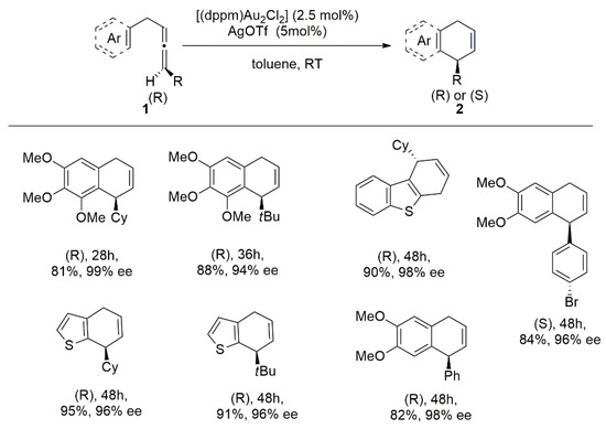 Ma and co-workers published a communication about the asymmetric hydroarylation of enantioenriched allenes (1) by using dinuclear achiral [(dppm)Au2Cl2] [dppm=methylenebis(diphenylphosphane)] in combination with AgOTf as catalyst to obtain aromatic ring-fused six-membered cycles containing a chiral stereocenter [14]. When reactions were performed with [AuCl(PPh3)]/AgOTf or [IPrAuCl] [IPr=1,3-bis(2,6-diisopropylphenyl)imidazolium]/AgOTf as alternative catalysts, systems gave low enantiomeric excess (ee). In addition, the reaction performed in the absence of either AgOTf or [(dppm)Au2Cl2] did not proceed attesting a high efficiency of chirality transfer for the [(dppm)Au2Cl2]/AgOTf pair. In the optimized conditions, the gold-catalyzed asymmetric cyclization proved to tolerate well a variety of aryl groups affording the corresponding 1,4-dihydroarene (2) in excellent yields and ee even when heteroaryl-substituted optically active allenes are used as substrate of the reaction (Figure 1).