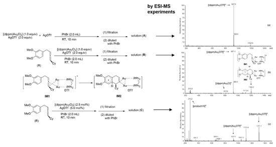 ESI-MS experiments to investigate the active intermediate of catalytic system. Reproduced with permission of [14]. MS spectrum (a) refers to solution A and shows the presence of ion [(dppm)Au2OTf]+ at m/z 927.0; MS spectrum (b) refers to solution B and shows the presence of dinuclear gold ion at m/z 1199.2 corresponding to the two possible intermediates IM1 and IM2; MS spectrum (c) refers to solution C. In this case, the analysis has been performed after 8h and shows the presence of the reaction product along with the active intermediate.